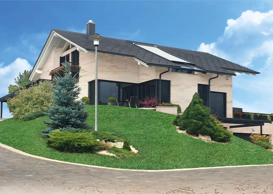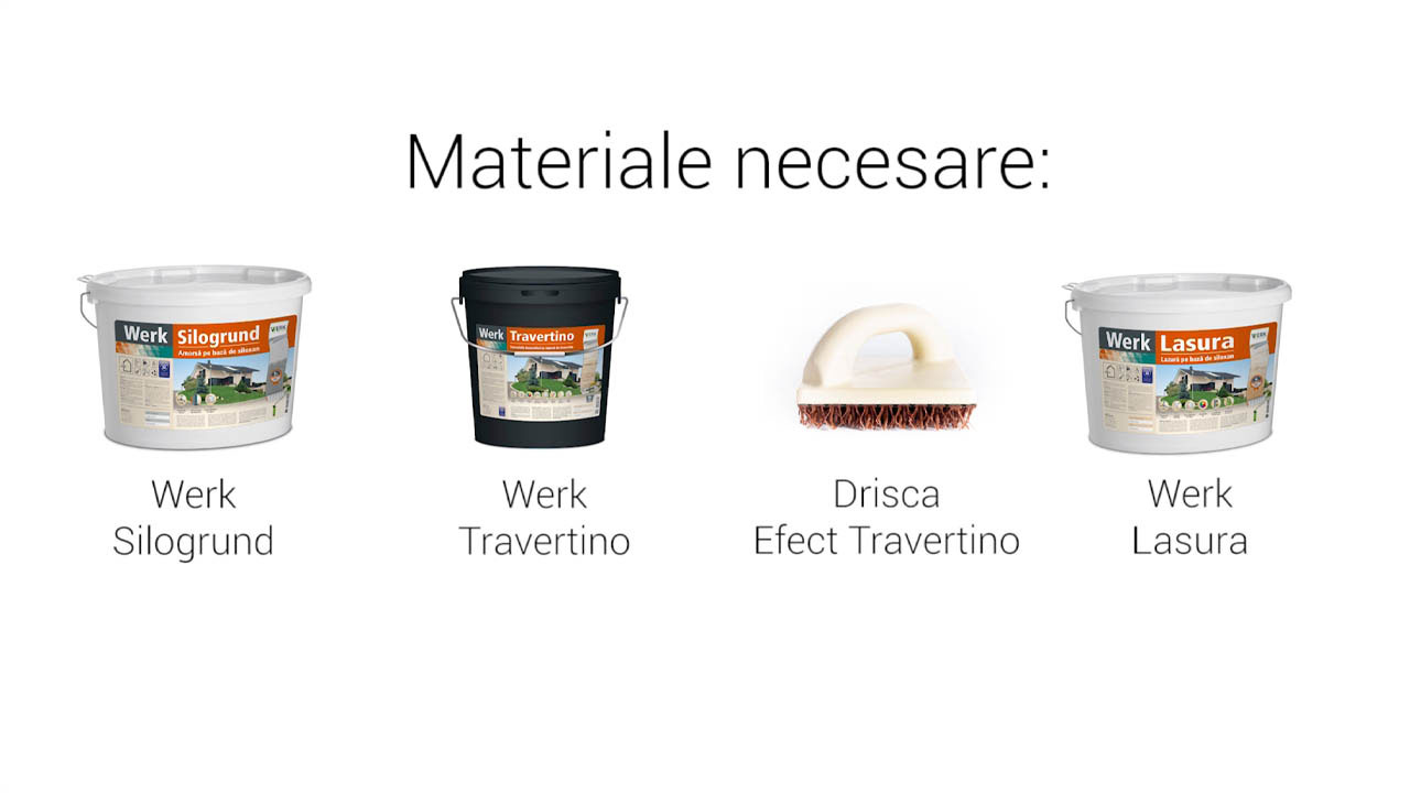 Tencuială decorativă pentru fațade cu aspect de travertin natural pentru suprafețele exterioare ale pereților, pe suporturi din beton, pe bază de calcar, tencuieli organice vechi etc.